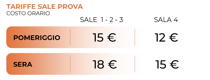 La tariffa oraria delle sale consente ai musicisti di scegliere la fascia oraria e la durata della prova in sala. Contattaci per conoscere le disponibilità e scegliere la soluzione migliore per le tue esigenze.